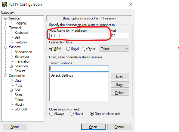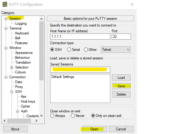 5.Session 메뉴에서 "Open" 하면 서버 접속 완료. 이 세션을 저장하고 싶으면 Saved Sessions 에서 이름을 넣고 Save
