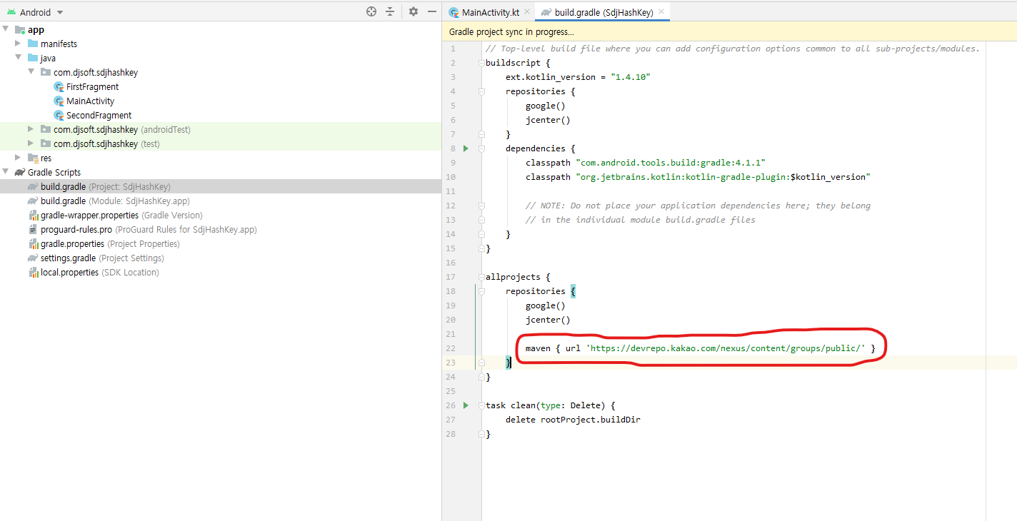 - bulid.gradle에 다음과 같이 maven 레파지토리를 설정합니다.
