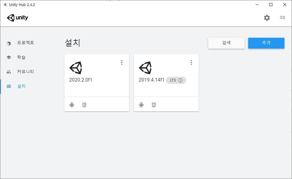 설치 버전 아래에 보면 안드로이드와 HTML5 아이콘이 붙어있다. 설치되었다는 뜻이다.