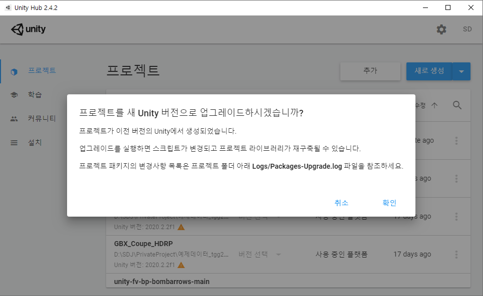 2020.2.3f1 버전으로 로딩해 보도록 하겠습니다.