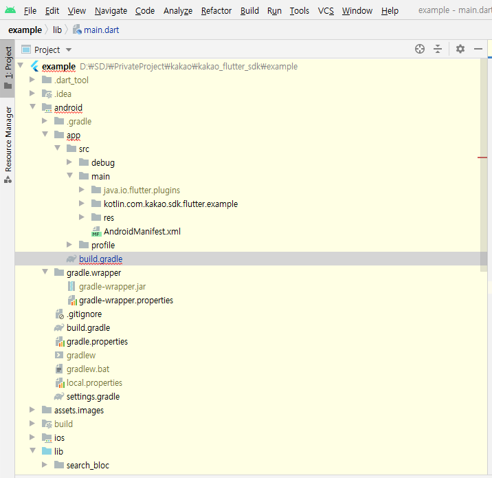 다운로드 받은 후 안드로이드 스튜디오로 example 폴더를 연다.