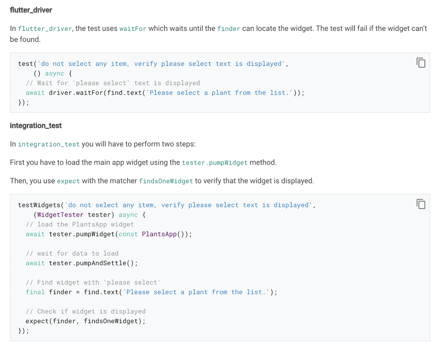 2020년 12월에 integration_test 패키지를 사용하여 종단 간 테스트를 수행 하는 새로운 방법을 발표했습니다 . 이 새로운 패키지는 통합 테스트를 수행하기 위한 권장 방법으로 flutter_driver 패키지를 대체하여 Firebase Test Lab 지원, 웹 및 데스크톱 지원과 같은 새로운 기능을 제공합니다.