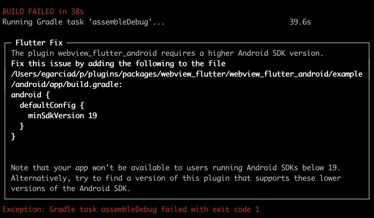 마지막으로 중요한 것은 Gradle 오류 메시지가 위협적일 수 있다는 귀하의 피드백을 들었습니다. 이러한 이유로 Flutter 도구는 이제 일반적인 문제에 대한 해결 단계를 제안합니다 . 예를 들어, 지원되는 최소 Android SDK 버전을 높여야 하는 플러그인을 앱에 추가하면 이제 로그에 "Flutter Fix" 제안이 표시됩니다.
