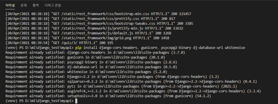 1. 필요 라이브러리 설치 먼저 라이브러리를 설치합니다. pip install django-cors-headers gunicorn psycopg2-binary dj-database-url whitenoise - django-cors-headers : cors 에러 방지 - gunicorn : 배포를 위한 도구 - psycopg2-binary, dj-database-url : Heroku에서 사용하는 DB postgresql - whitenoise : 정적 파일의 사용을 돕는 미들웨어 1) pip freeze > requirements.txt : 패키지 의존성 관련 텍스트 파일 저장(위치:root 폴더) 2) runtime.txt 파일 열어서 python-3.9.4 입력 후 저장 : python버전 명시(..